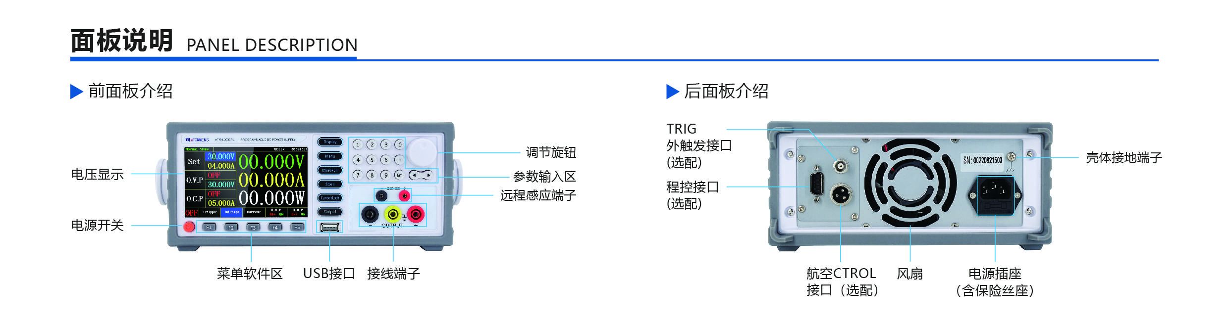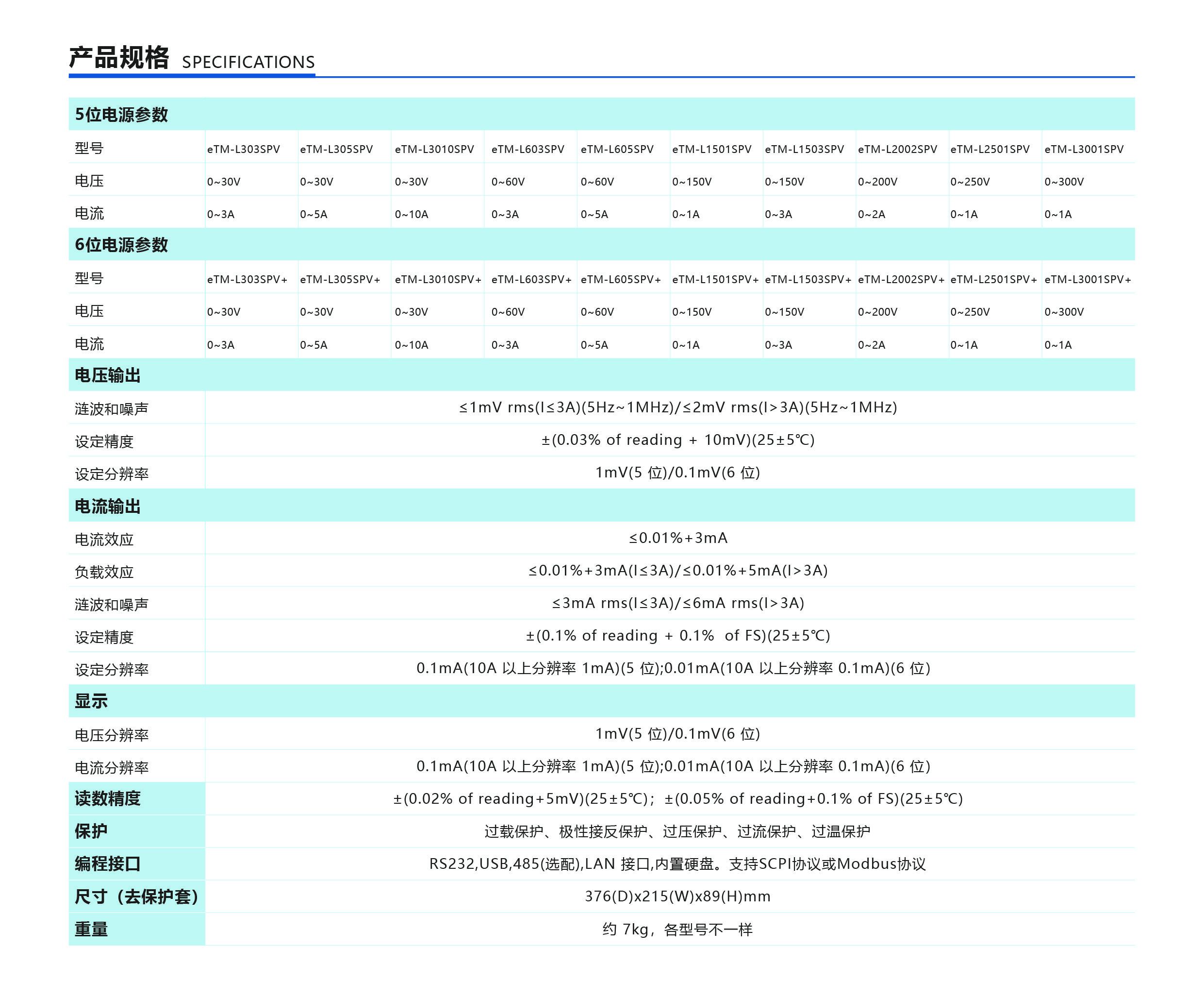 | eTM-L1503SPL | 0~150V | 0~3A | 1mV;0.1mA | ±(0.02% of reading±5mV)(25±5℃);± (0.05% of reading±0.1% of FS)(25±5℃) | 标配RS232串口、触发串口、SENSE串口、航空接口、220/110切换串口;选配RS485串口、USB串口、模拟量串口(需配合RS232串口才能使用) |